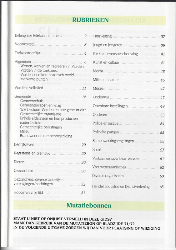 De gemeentegids geeft informatie over Onderwijs, Culturele Fondsen, Bibliotheken, Religie, Begraafplaatsen, Sportgelegenheden, Verkeer en Vervoer, Politiek, Vakorganisaties, Verenigingen, Gezondheidszorg, Openbare Orde en Veiligheid en de gemeentelijke organen in de gemeente Vorden.