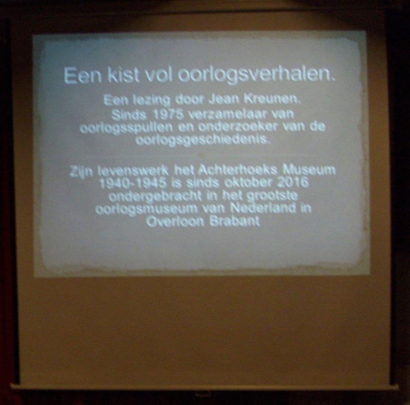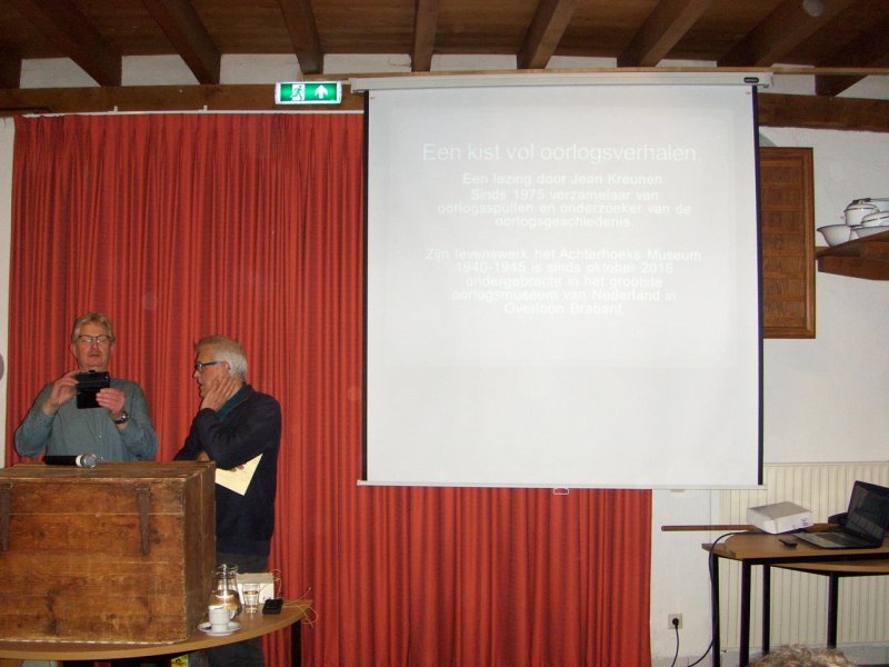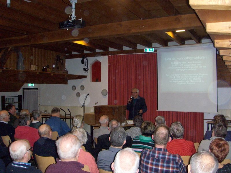 Voor een afgeladen volle zaal 'Het Anker' in Steenderen vertelde Jean Kreunen uit Hengelo (Gld) het verhaal over zijn oorlogsverzameling, die begon op een zolderkamertje, werd ontplooit in het 'Achterhoeks Museum 1940-1945' en vandaag de dag is te bezichtigen in het Oorlogsmuseum in Overloon Brabant. Maar het ging niet om de verzameling alleen deze avond, destemeer ging het om de verhalen die bij de gevonden attributen horen.